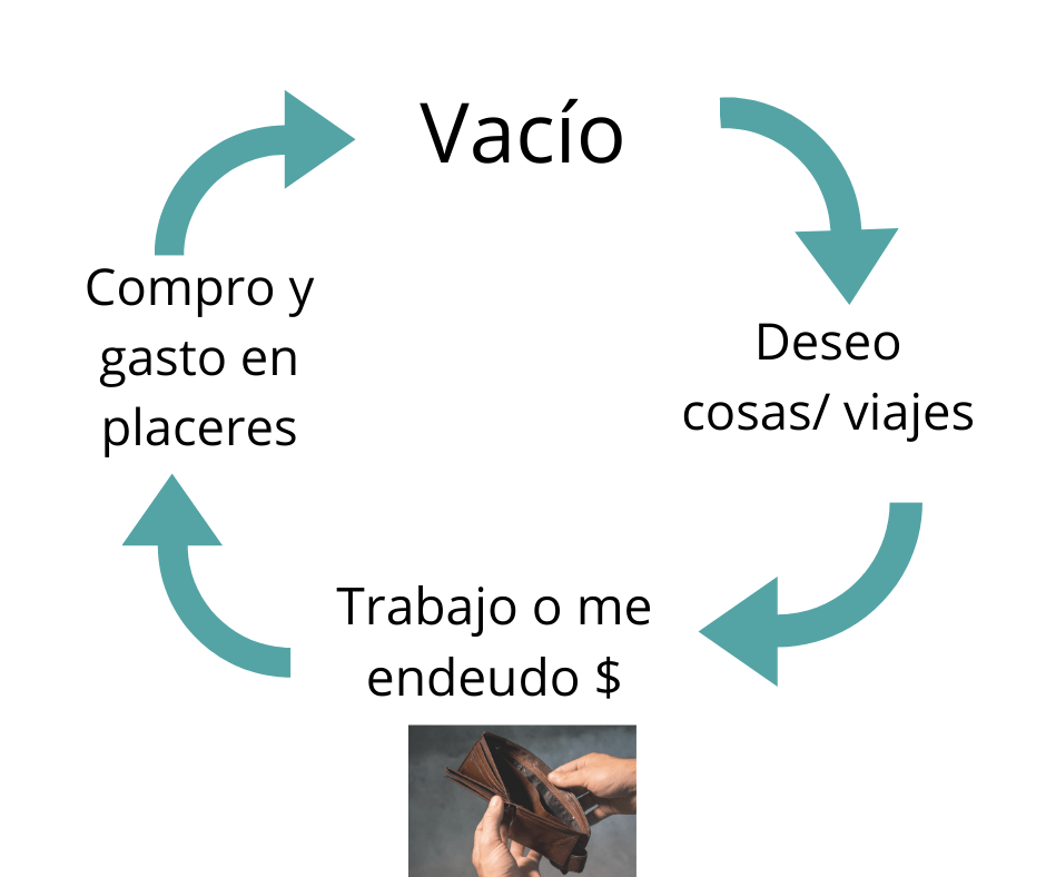 Todos los testimonios que se pueden ver en el documental hablan sobre el problema del consumismo, de cómo nace de un vacío interno de la persona, y eso también lo confirman los expertos. Desde siempre el vacío existencial ha sido la gran tragedia para la humanidad, una vida vacía sin sentido, una sensación ante la que muchos optan por distractores, “entretenimientos” como le llamaba Blas Pascal. Este vacío nos lleva a una búsqueda de “algo que nos llene”, la mayoría lo hacemos comprando cosas, haciendo viajes, buscando una felicidad que se promete en la propaganda, venida de fuera, que se puede comprar. La compra de algún artículo genera una satisfacción, una sensación placentera, que no permanece por mucho tiempo, lo que nos estimula a buscar algo diferente. Muchas veces para satisfacer esos deseos, debemos trabajar mucho o endeudarnos, lo cual frecuentemente acarrea más problemas (cansancio, estrés, irritabilidad, poco tiempo para la familia, etc).