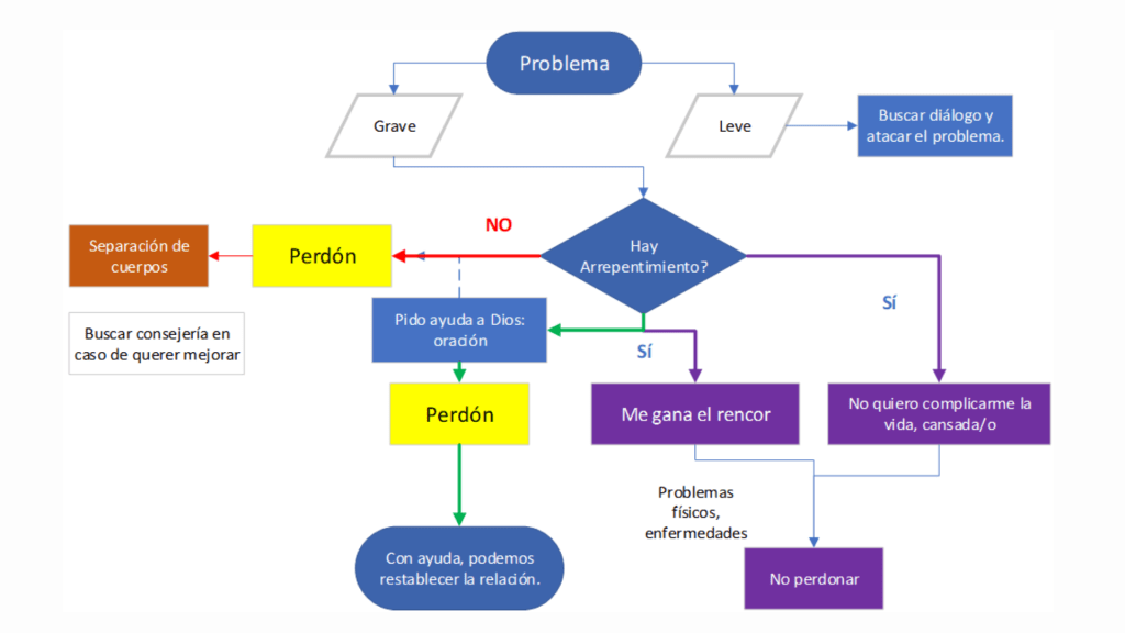 En un matrimonio siempre es importante analizar el problema lo antes posible, pero si se trata de un problema grave. Debo calmarme, ver si la otra persona está arrepentida, si no lo está; a veces es conveniente la separación de cuerpos (un caso grave puede ser la infidelidad). Pero si hay arrepentimiento, debo orar para pedirle a Dios sabiduría (pueden utilizar también la oración del perdón y repetirla varias veces) y que nos ayude a reestablecer nuestra relación. Debo aprender a separar el «pecado» del «pecador».
